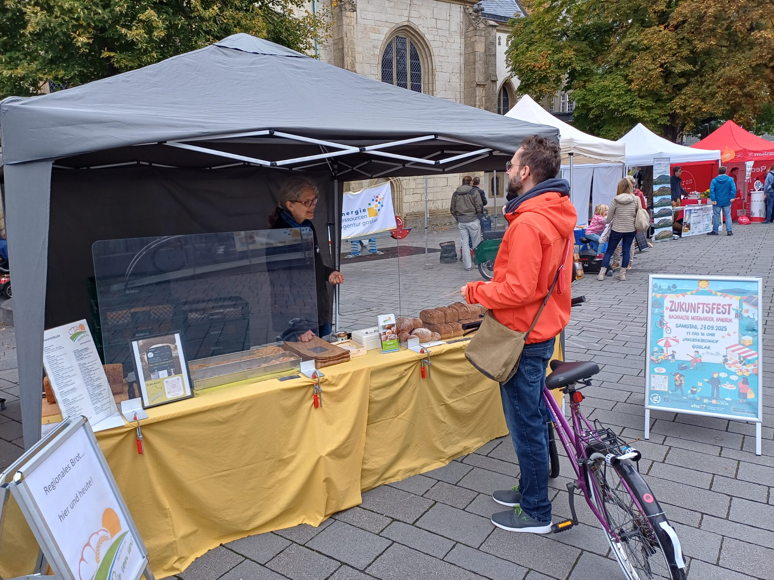 Am Stand nebenan präsentierten Vertreter der Städte Seesen und Braunlage die Klimataler-App, mit der nachhaltiges Verhalten spielend einfach belohnt wird. Für das Kulinarische sorgten die Biobrote und Kuchen der Harzbrot eG, Honig-Kostproben von Bienenwerk und die Ökomodellregion mit Bioprodukte aus der Region.